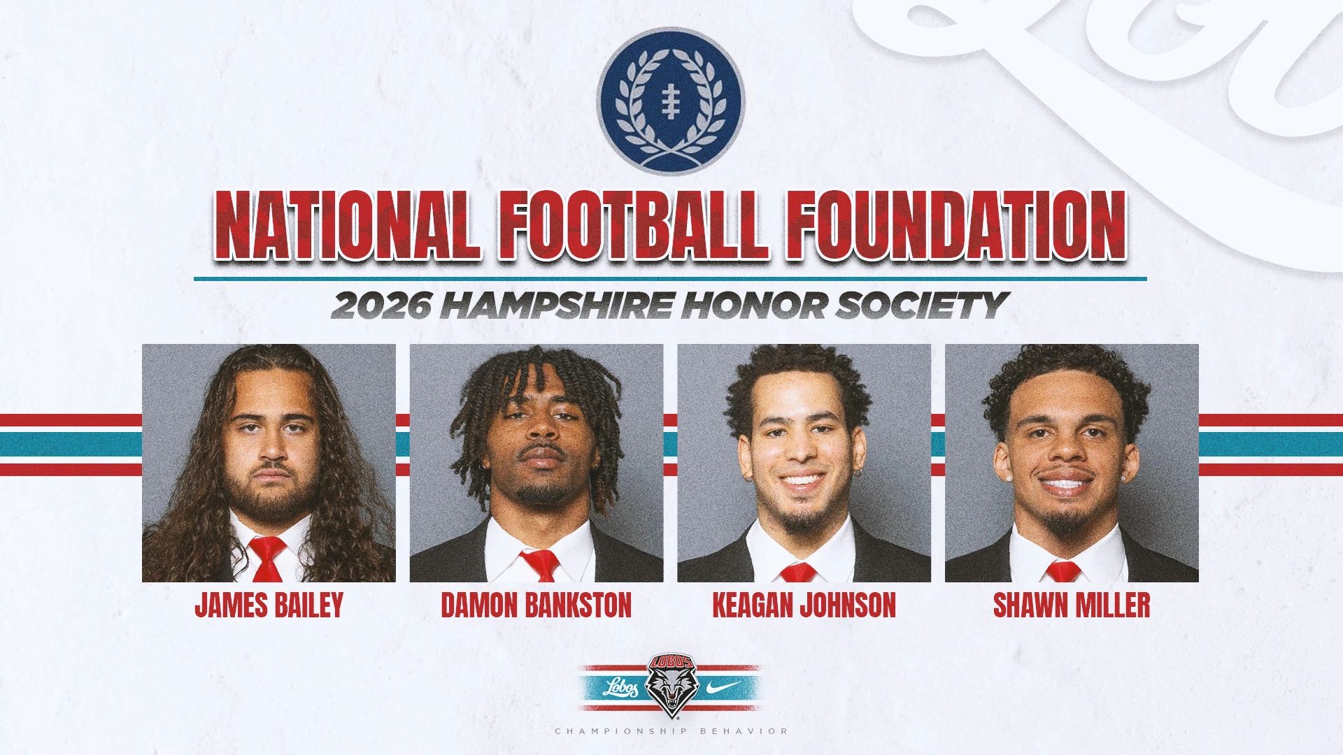 🔺 Fantastic Four. The New Mexico Lobos had four student-athletes named to the 2025 NFF Hampshire Honor Society. James Bailey, Damon Bankston, Keagan Johnson, and Shawn Miller were all honored. The NFF Hampshire Honor Society is chosen annually. It comprises college football players from all NCAA, NAIA, and sprint football divisions who each maintained a cumulative 3.2 GPA or better throughout their college careers. The program strengthens the organization’s leadership in supporting academic performance among student-athletes at colleges and universities nationwide with football programs.