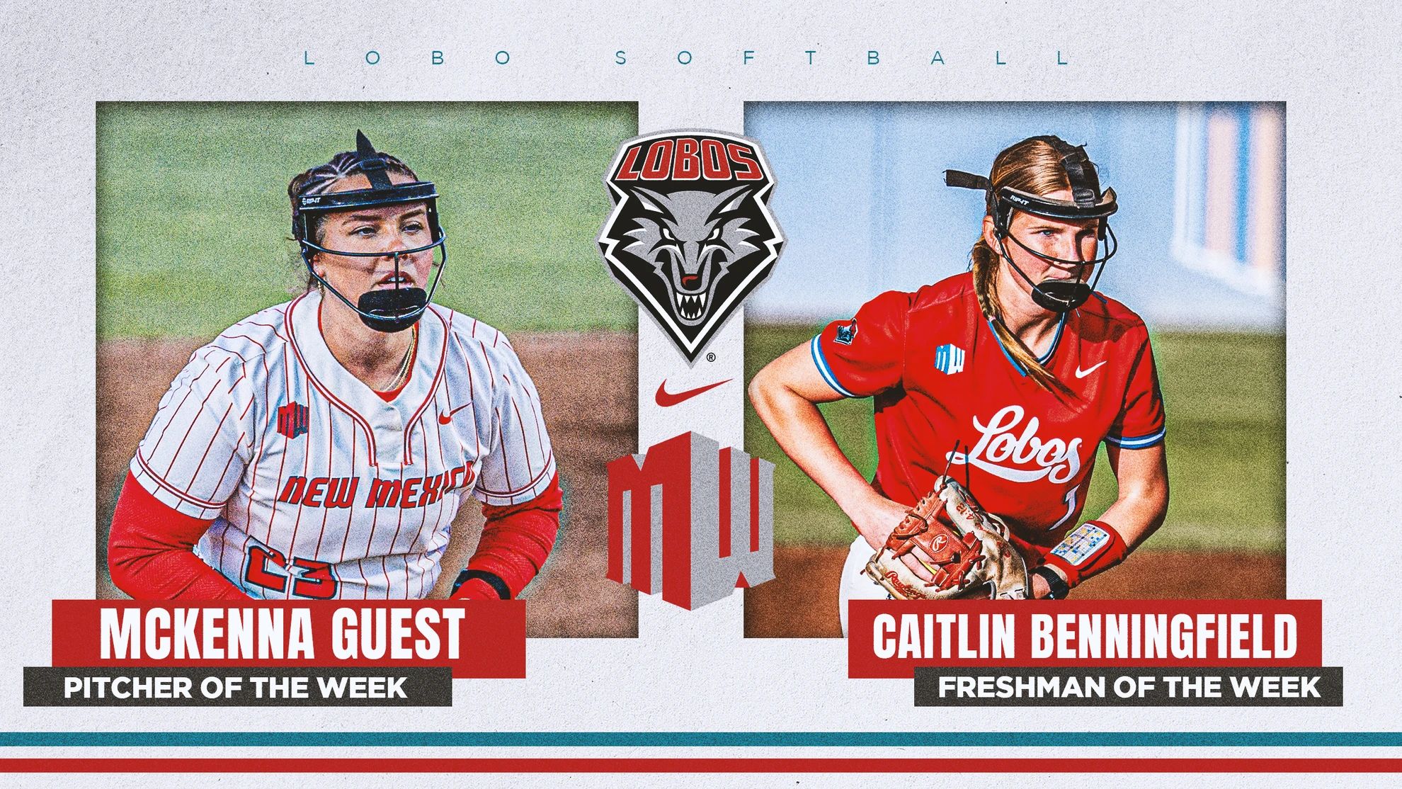 🔺 Best Duo. The softball team had two players earn Mountain West weekly honors. McKenna Guest was named the Pitcher of the Week. Caitlin Benningfield was named the Freshman of the Week. The duo led the pitching staff to a 1.27 ERA in the series against Boise State, with the Lobos outscoring the Broncos 21-5, holding the Broncos to a .195 batting average and never trailed in the 22.0 innings.