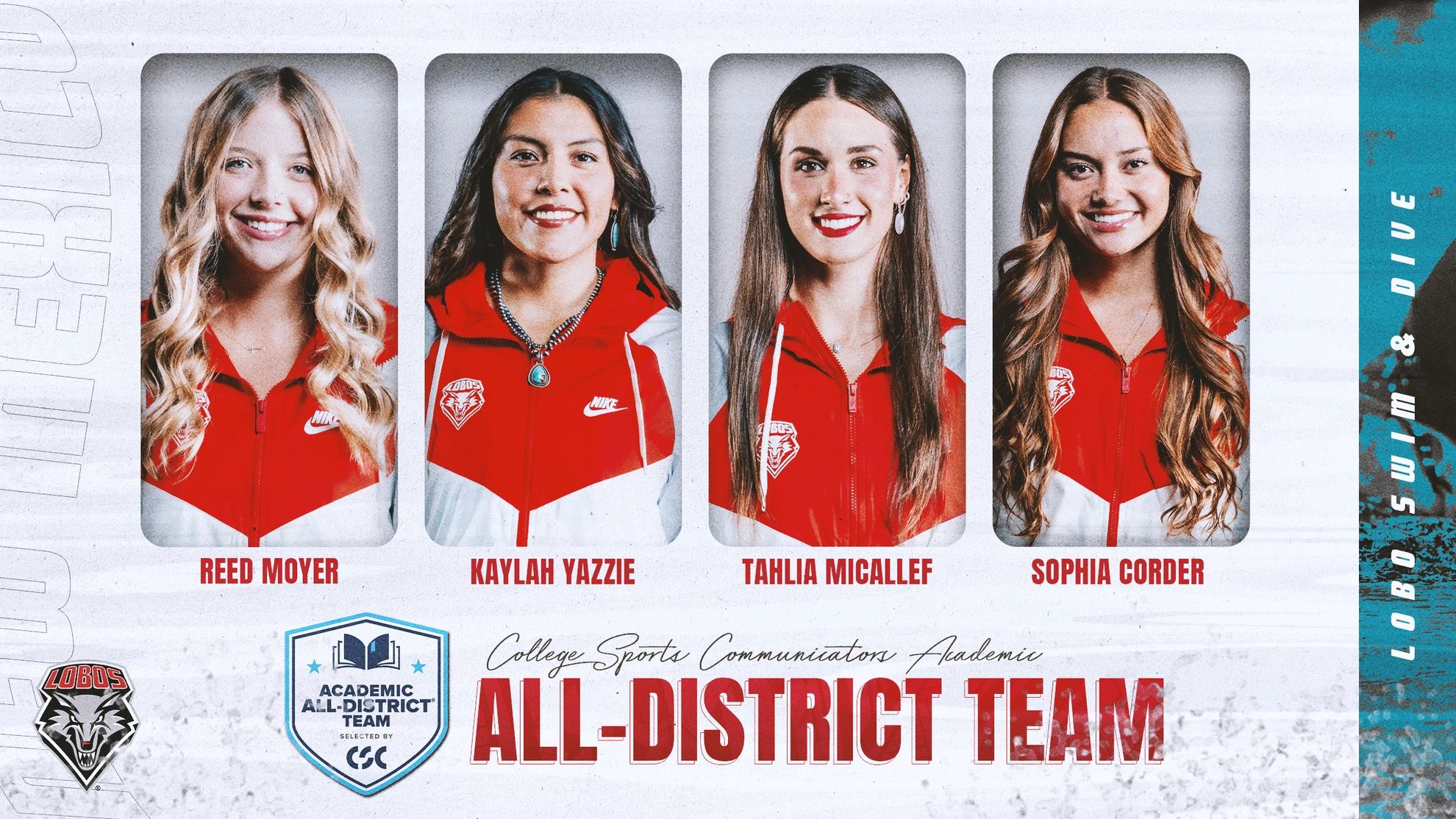 🔺 Fantastic Four. Four Lobos, Sophia Corder, Tahlia Micallef, Reed Moyer, and Kaylah Yazzie, were all honored as members of the College Sports Communicators Academic All-District team. In order to be eligible for the Academic All-District team, student-athletes must be regular performers during the season, compete in at least 75% of the meets, and have at least a 3.5 grade point average.