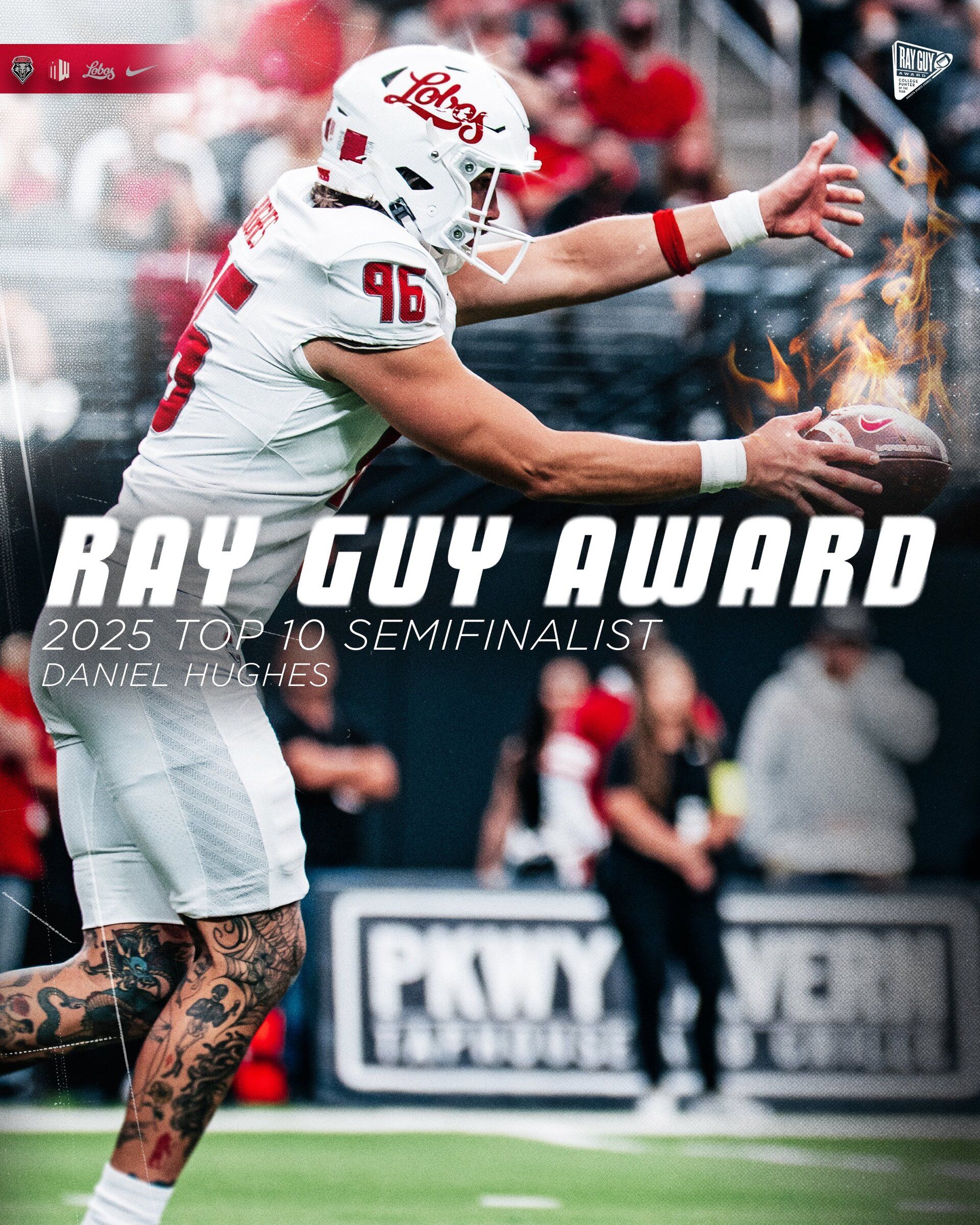 🔺 Semifinalist. Football punter Daniel Hughes was named a semifinalist on the Ray Guy Watch List. He is one of 10 semifinalists for the award. Hughes is the third Lobo punter to be named a semifinalist and is attempting to become the first UNM finalist for the award. He has punted 24 times and is averaging 46.2 yards per punt.