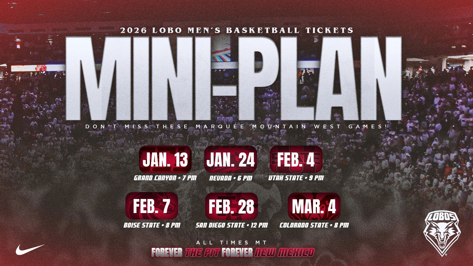 Good morning, New Mexico. Fans can now purchase a 2025-26 Lobo basketball six-game mini plan of Mountain West games at The Pit at GoLobos.com/tickets. The package begins as low as $118. Find out more here.