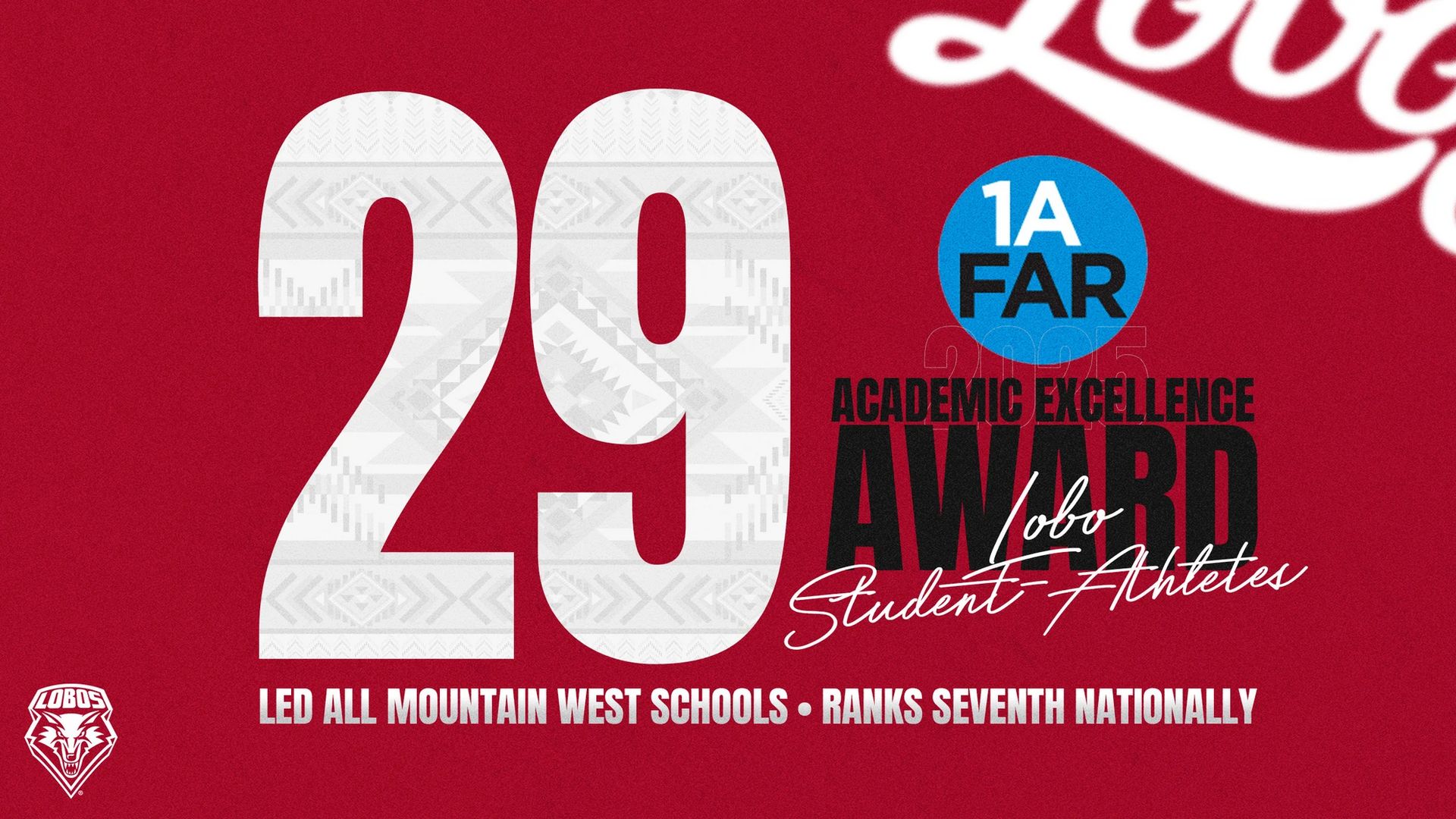 🔺 Academic Honors. There were 29 Lobos honored with the 1A Far Academic Excellence Award. Overall, 13 of UNM’s 18 programs were represented on the squad. The 29 representatives led all Mountain West schools, ranking seventh nationally.